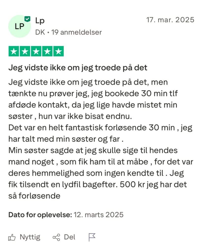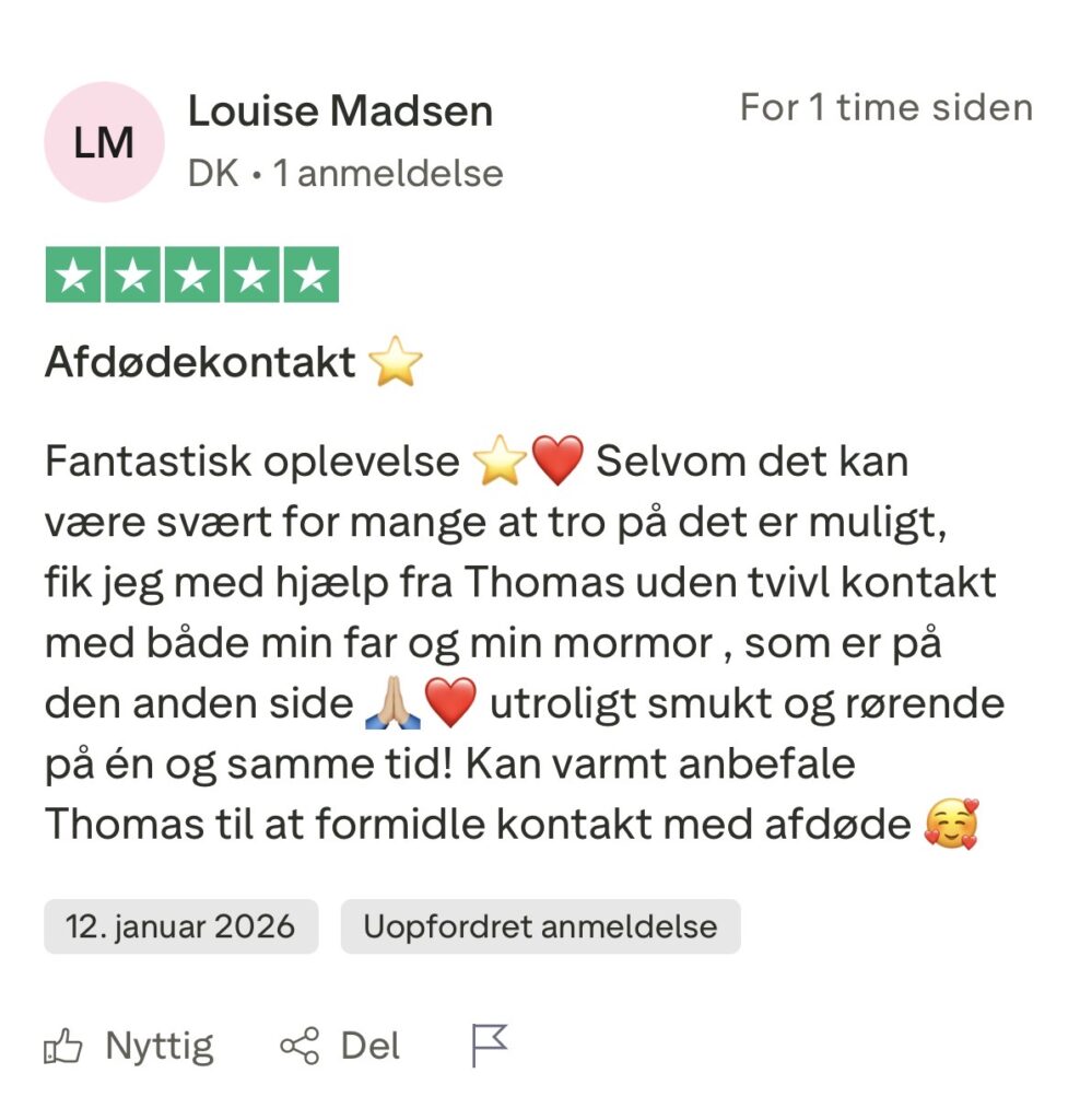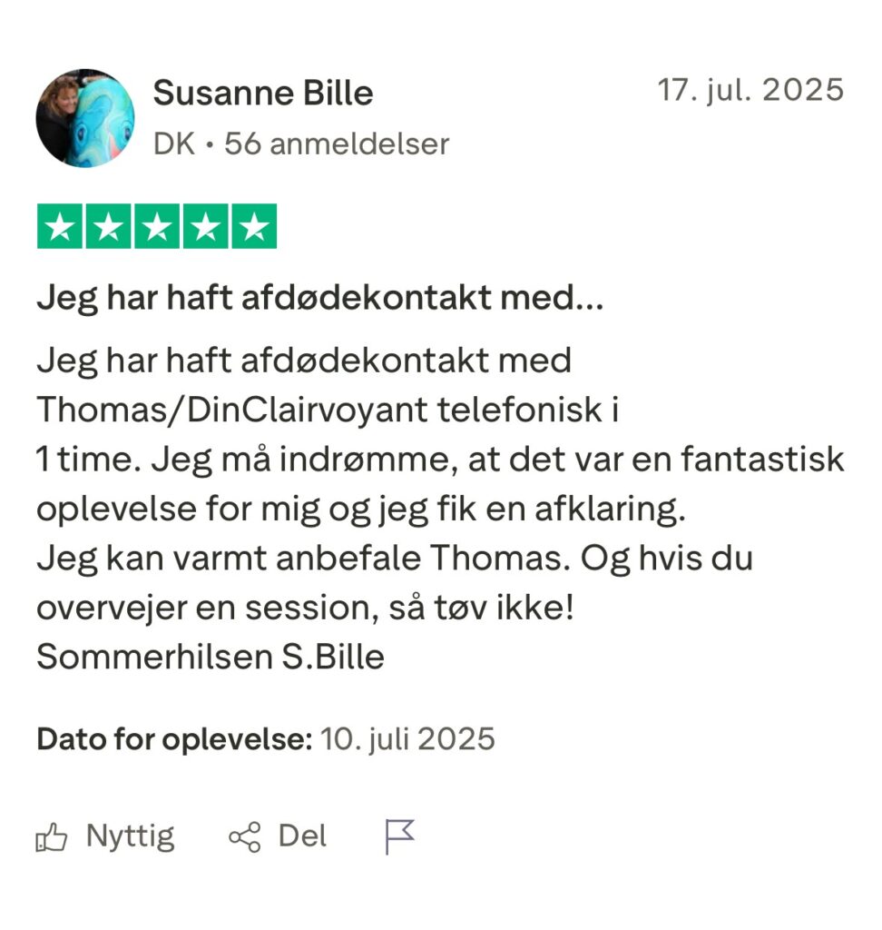Min erfaring og personlige historie gør, at jeg kan møde dig i både sorgen og håbet. Mange klienter fremhæver mig som en clairvoyant, der ikke blot giver beskeder, men også hjælper med at forstå dem i en større sammenhæng.