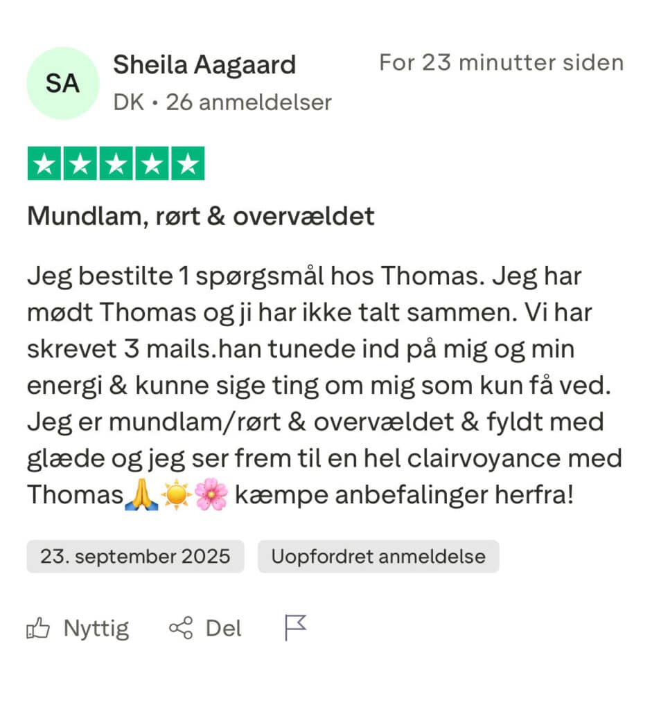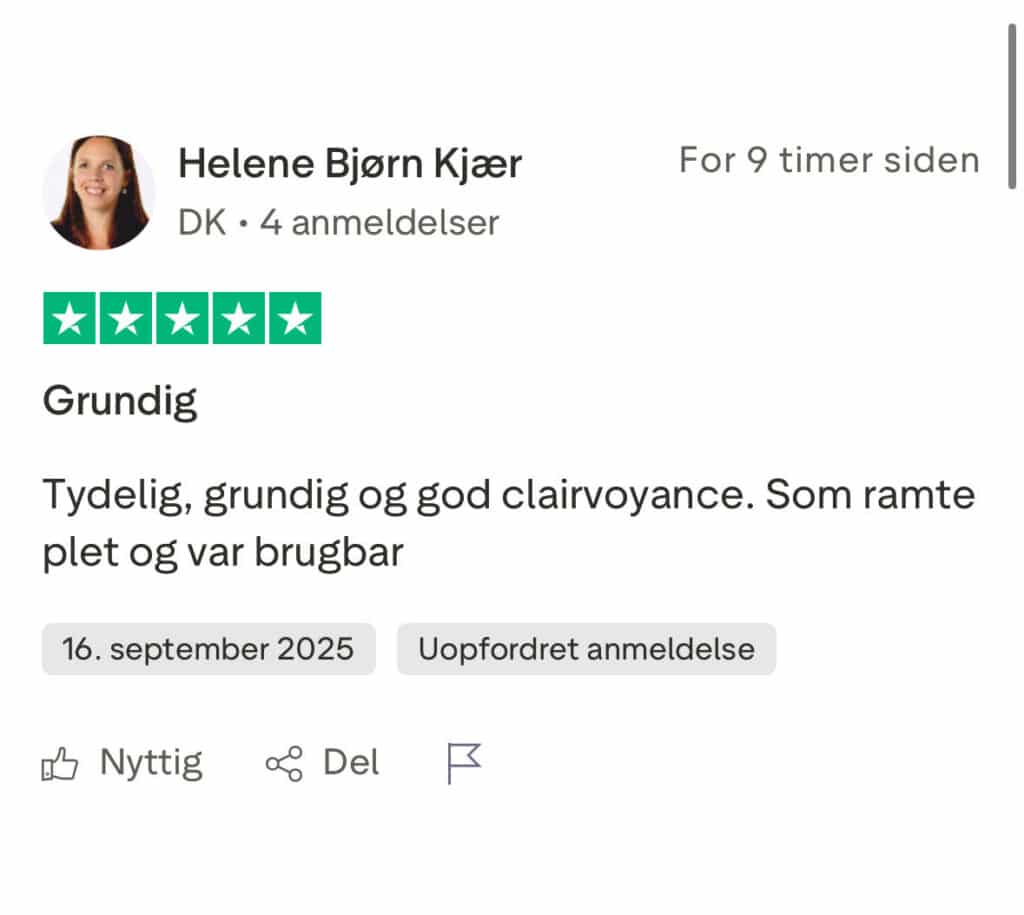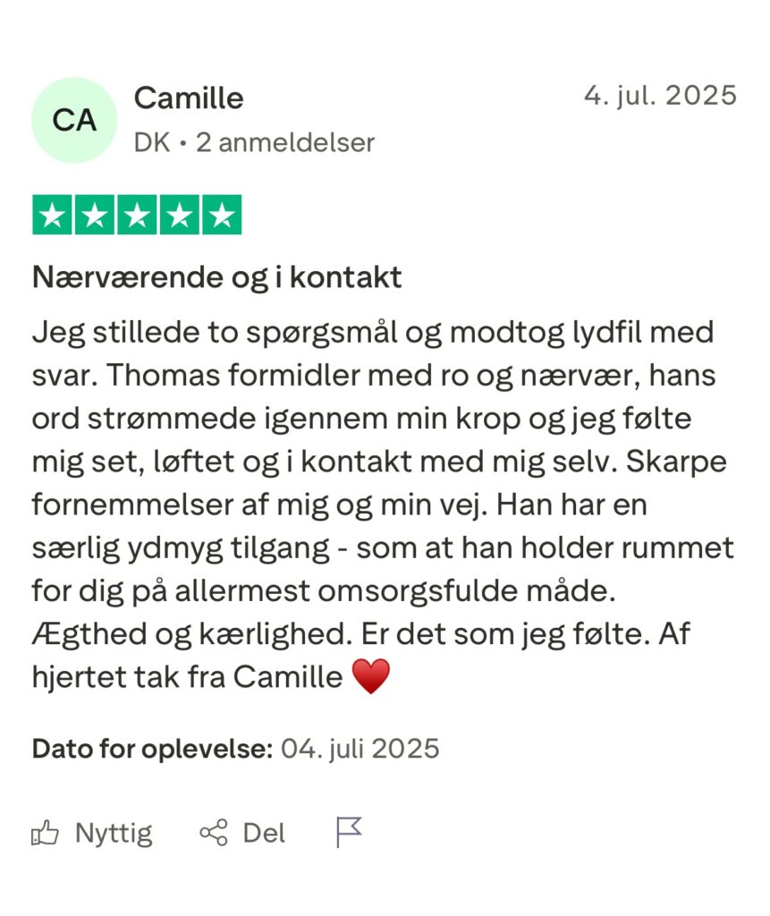 Uanset om du søger den bedste clairvoyant, ønsker afdødekontakt eller blot har brug for en guidende hånd, tilbyder jeg sessioner både fysisk som clairvoyant København og clairvoyant Sjælland – samt telefonisk i hele landet, så du kan få hjælp præcis der, hvor du er. Har du brug for en clairvoyant anbefaling, er du velkommen til at læse mine mange tilbagemeldinger fra tidligere klienter.